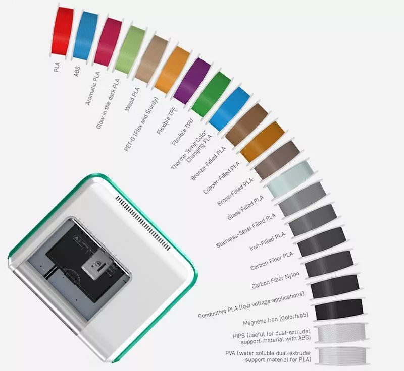 PLA, ABS, Elastic, PVA, HIPS, PET-G, TPE, TPU, Conductive, Flexible, Wood Filled, Material-Filled, PP, PA, PC, ASA, Carbon Fiber.