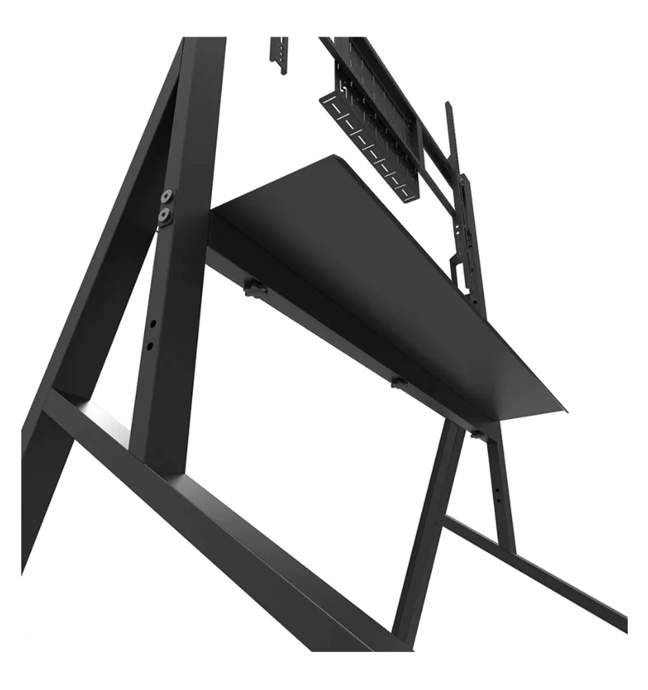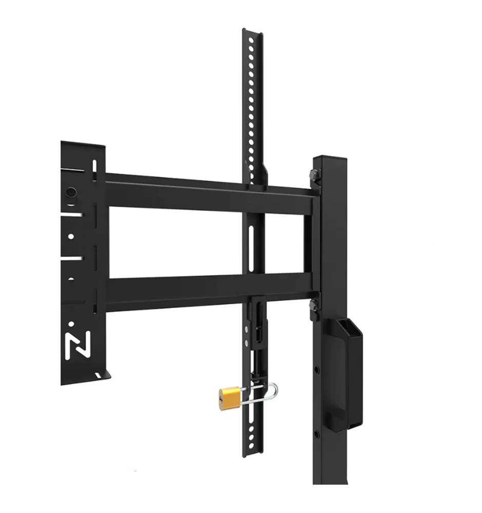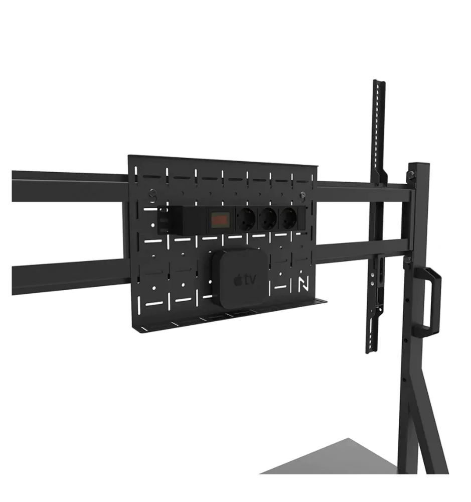 Półka multimedialna (montowana z przodu i z tyłu) o maksymalnym udźwigu 10 kg oraz stojak na sprzęt AV są dołączone i opcjonalne do instalacji. Ekran na wózku można zabezpieczyć poprzez zablokowanie wsporników za pomocą kłódki (brak w zestawie).