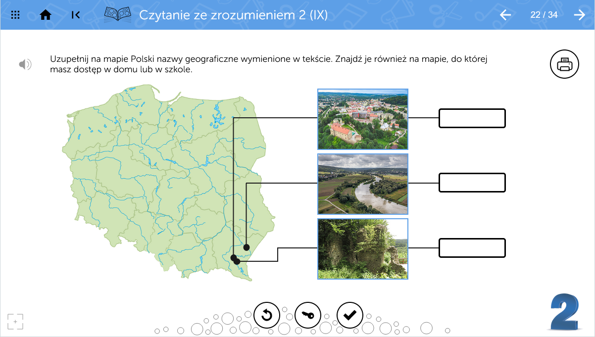 ● zestawy ćwiczeń interaktywnych sprzyjające zwiększeniu kompetencji w obszarze czytania i rozumienia tekstu (od krótszego do dłuższego) oraz poleceń, a także przetwarzania i wykorzystywania informacji w różny sposób,